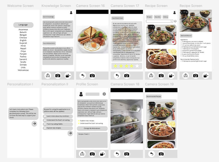 Language Selection: Language barriers were the primary research finding, so the entire app, every lesson, recipe, and label, functions in the user's chosen language.Knowledge Section: Delivers accessible, bite-sized diabetes information in multiple formats to reduce the reading burden often associated with health content.Personalized Recipes: An onboarding quiz captures user goals, dietary preferences, and cultural background to drive personalized recipe recommendations. Ingredients less suitable for diabetes management are subtly flagged, building health knowledge passively through everyday use.Food Camera: Users scan a meal or fridge contents using AI to analyze nutritional content and generate healthy, diabetic and culturally friendly recipe suggestions relevant to diabetes management.