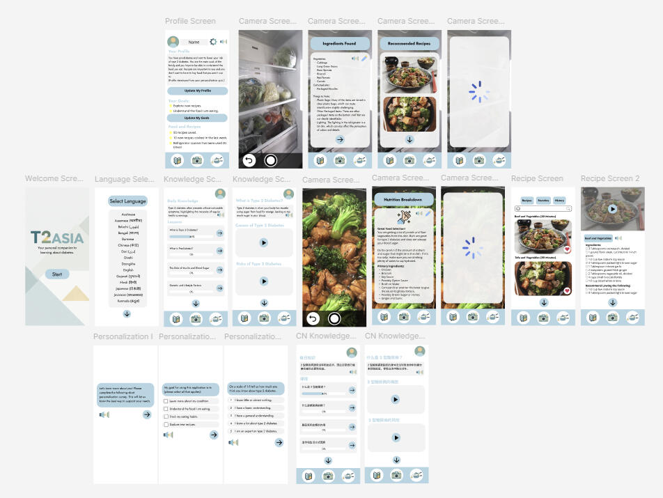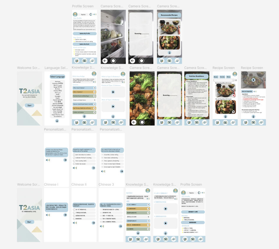 Type 2 diabetes carries severe health risks, but for Asian communities, the threat is compounded by factors that existing support tools routinely ignore. Asians face higher susceptibility due to distinct genetic factors and elevated risk even at lower BMIs. Alarmingly, onset is increasingly affecting younger generations, with higher associated mortality rates and a significant proportion of cases going undiagnosed.The Design Solution: A simple to use mobile application that delivered diabetes knowledge in users' preferred language and dietary guidance that respected their cultural background. T2Asia is a mobile application that personalizes type 2 diabetes education and dietary guidance for the Asian community, eliminating language barriers and addressing cultural needs.