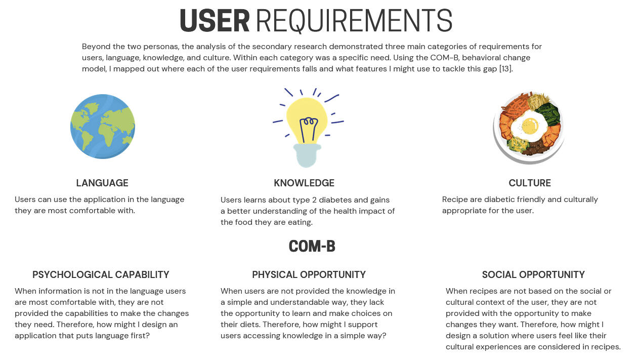 To ensure the features I designed genuinely addressed these barriers, I applied the COM-B behavioral change model as a design framework, mapping language needs to Psychological Capability, knowledge gaps to Physical Opportunity, and cultural considerations to Social Opportunity. This kept design decisions anchored to real user needs rather than assumptions.