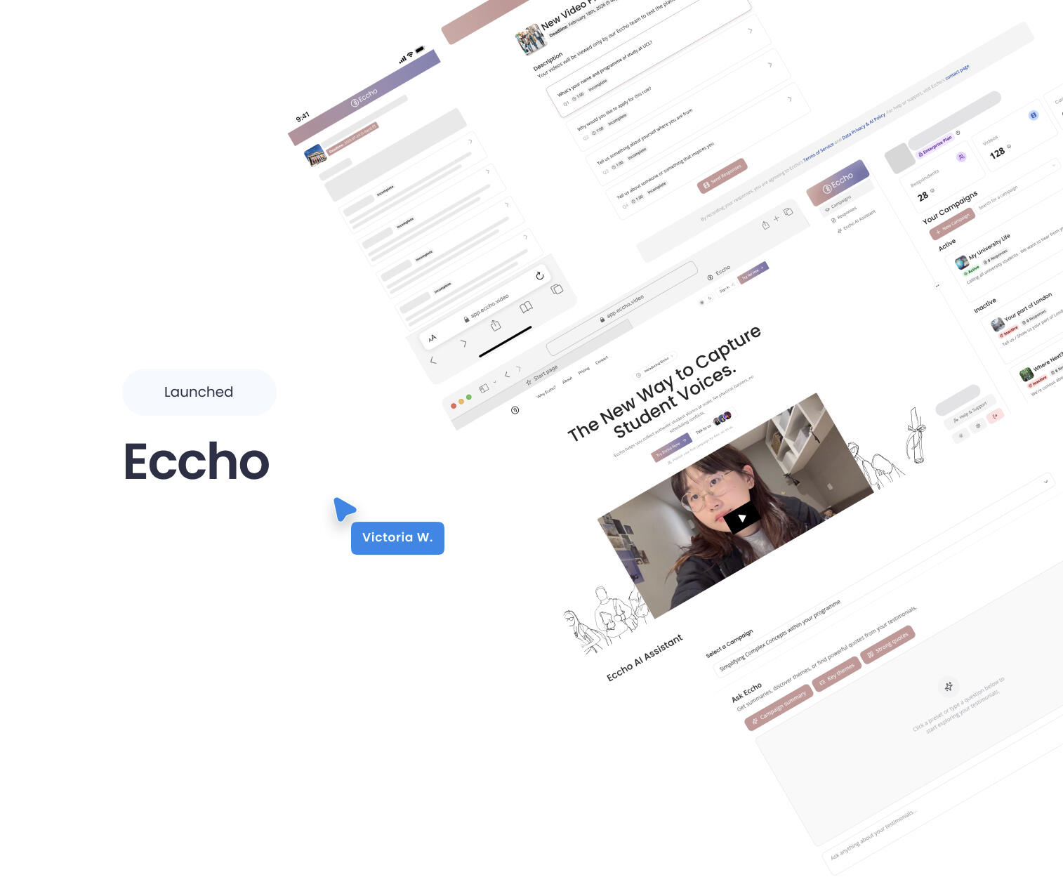 Core Principles: GDPR compliance and accessibility were foundational to our design process, not afterthoughts. We adopted "privacy by design" to protect user data while strictly adhering to WCAG standards, ensuring the platform feels inclusive and supportive.Campaign: Initiate a new campaign to begin collecting video responses. Users can either create campaigns manually or utilize our AI assistant to generate prompts and structure.Eccho AI Assistant: Powered by Copilot, this feature automatically transcribes video content, summarizes themes, and extracts quotes for immediate use.